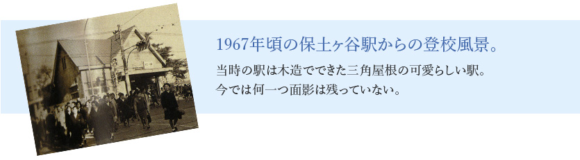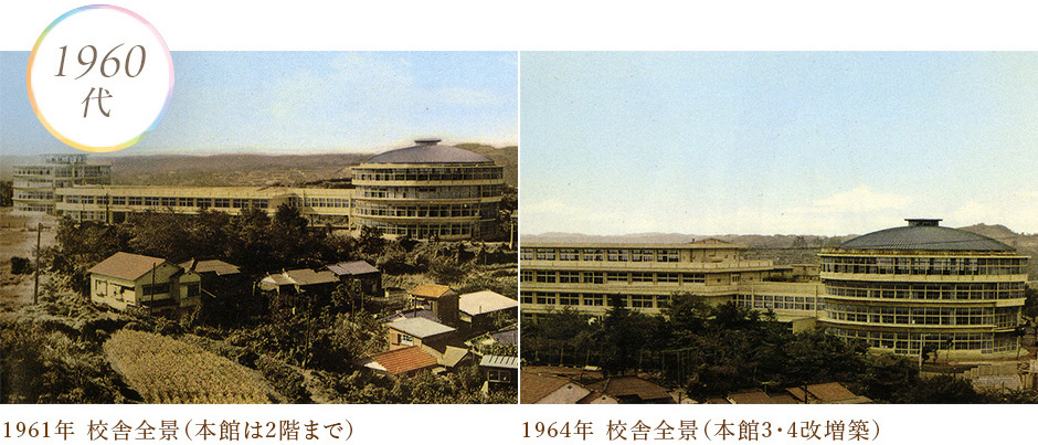 生徒数の増加に伴い、現在の保土ヶ谷校地への新校舎建設・移転計画が具体化。1958年に北円型校舎、翌年に南円型校舎が完成しました。この年、初めて自前のグランドで体育祭を行いました。このグランドはもともと大根畑で、生徒・職員が手作りで整備したという記録が残っています。