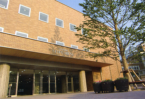 校舎南側から新館を望む。手前は多目的コート。主にテニスコート・バレーコートとして使用されていた。球技大会ではバレーボールの試合で熱く燃えた思い出のある場所です。球技大会、体育祭のメイン会場は、立派なスタンドを設えたグラウンドで、その周りは春になると桜が一斉に咲き乱れ、とてもきれいでした。